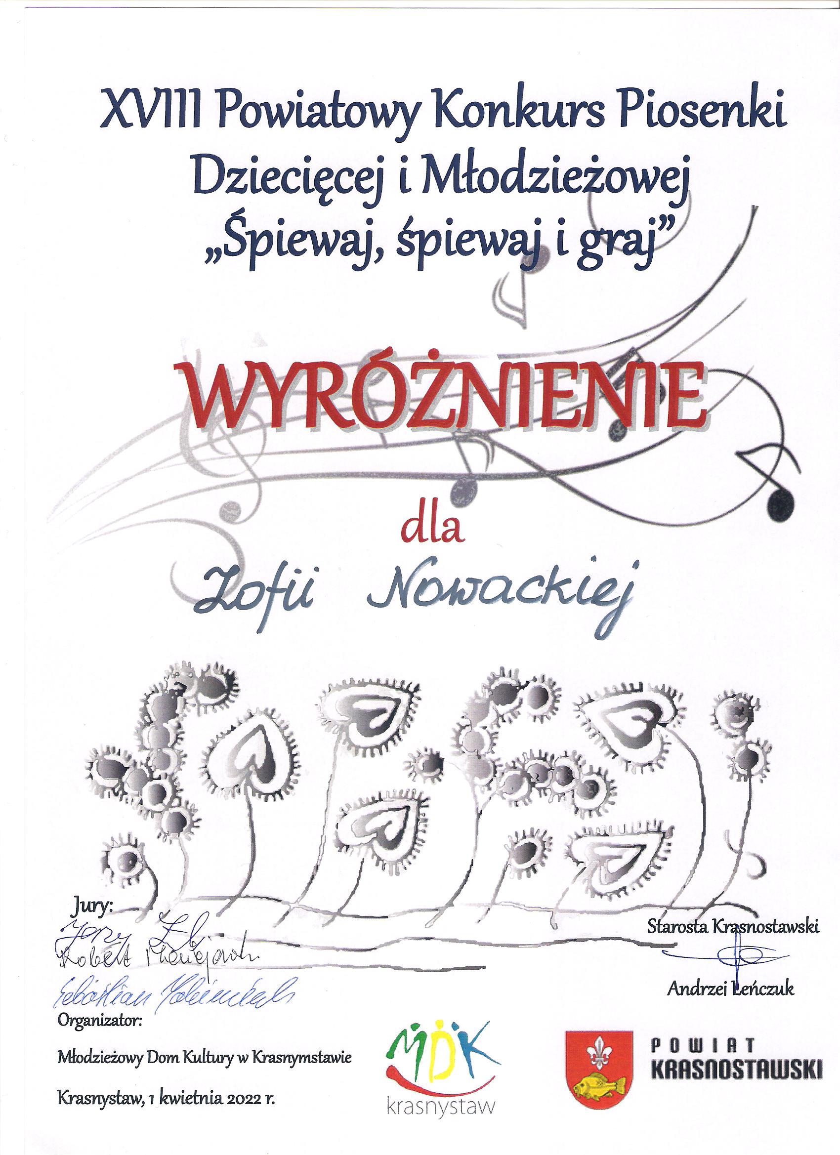 1 kwietnia 2022 roku w Młodzieżowym Domu Kultury w Krasnymstawie odbył się XVII Powiatowy Konkurs Piosenki Dziecięcej i Młodzieżowej „Śpiewaj, śpiewaj i graj”. Do udziału w konkursie zgłosiło się 38 uczestników. Szkołę Podstawową w Siennicy Nadolnej reprezentowała uczennica klasy VIII b Zofia Nowacka, która zdobyła wyróżnienie. Gratulacje.