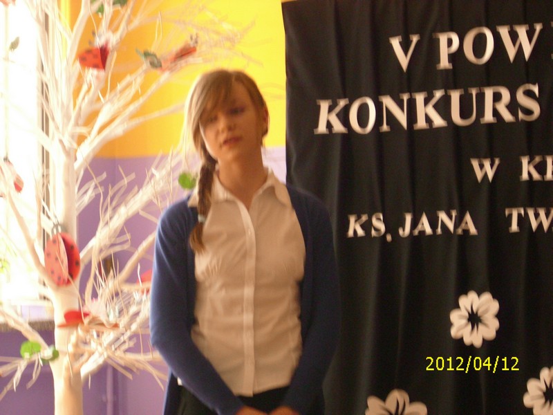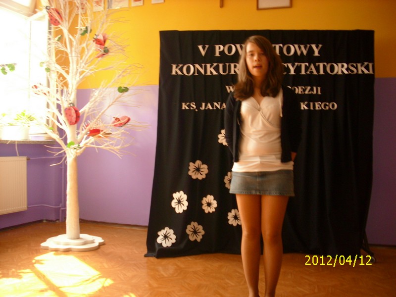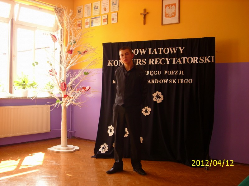 Trzydziestu siedmiu recytatorów poezji księdza Jana Twardowskiego było uczestnikami Powiatowego Konkursu Recytatorskiego, którego organizatorem jest nasza szkoła. 12 kwietnia już po raz piąty gościliśmy u nas tych, którzy sięgają po tomiki poezji księdza Twardowskiego i potrafią jego wiersze recytować w sposób wyjątkowy. Komisja konkursowa: pan Andrzej Woźniak – przewodniczący, panie Barbara Bucht i Beata Zadrąg wyłoniła sześciu laureatów. Przewodniczący podkreślał, że wybór był trudny ze względu na wysoki poziom przygotowania uczestników