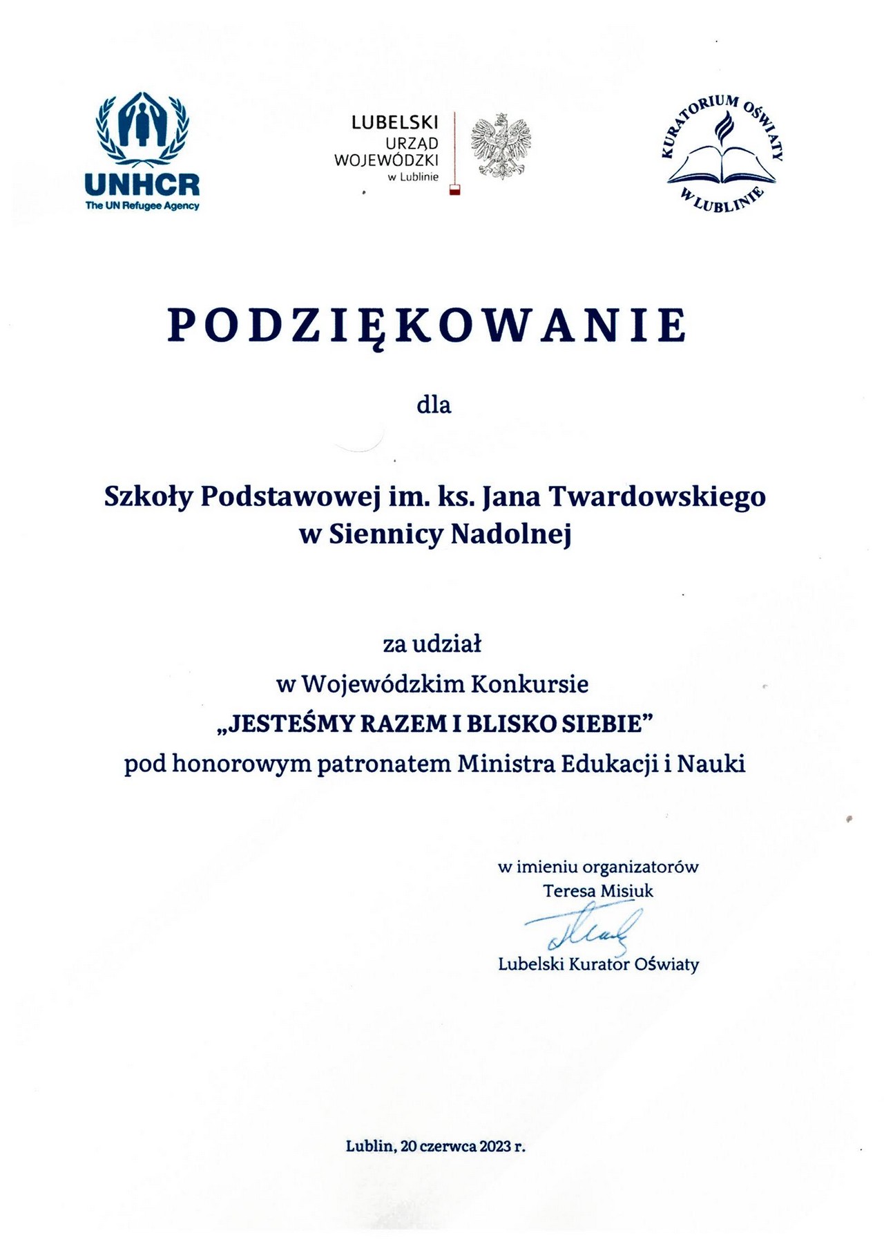 20 czerwca 2023 r. w Sali Błękitnej Urzędu Wojewódzkiego w Lublinie odbyło się wręczenie nagród, wyróżnień i dyplomów uczestnikom konkursu „Jesteśmy razem i blisko siebie”.