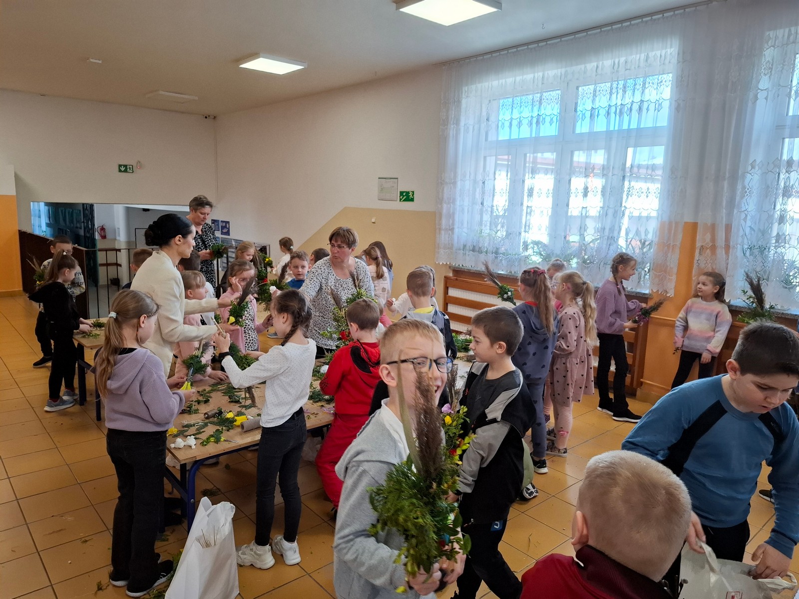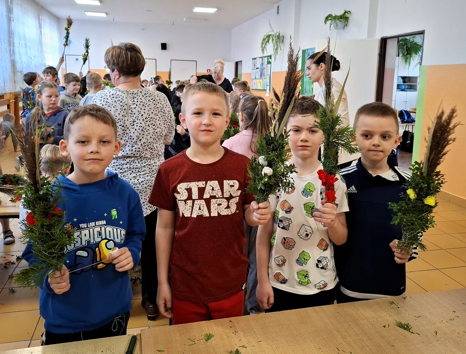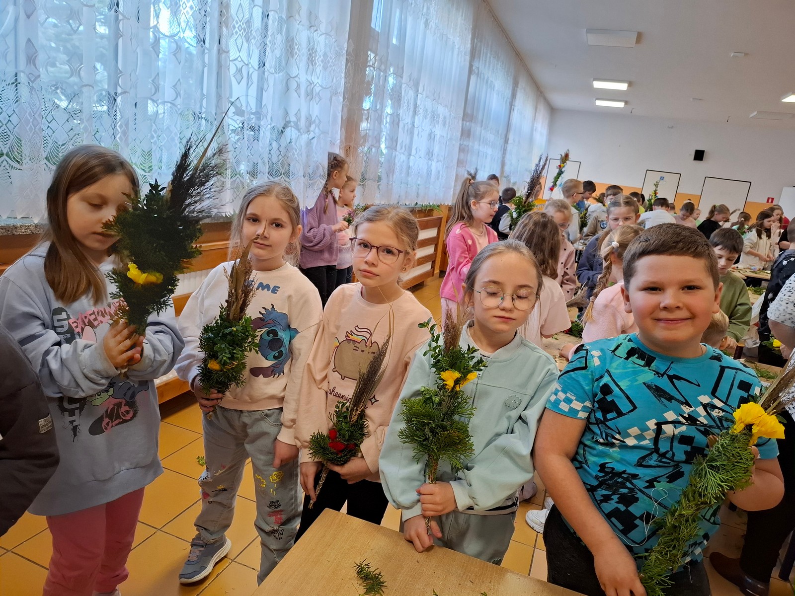 10 kwietnia 2025 roku uczniowie klas I-III wzięli udział w warsztatach artystycznych prowadzonych przez twórczynię ludową, panią Annę Krzyżanowską. Pod jej kierunkiem dzieci wykonały tradycyjne palmy wielkanocne, wykorzystując naturalne materiały i poznając regionalne techniki zdobienia.Zajęcia były okazją do kultywowania lokalnych tradycji, rozwijania zdolności manualnych oraz poznania symboliki wielkanocnych ozdób. Dzięki zaangażowaniu uczestników i wsparciu pani Anny powstały piękne, kolorowe palmy, które wprowadziły świąteczny nastrój.