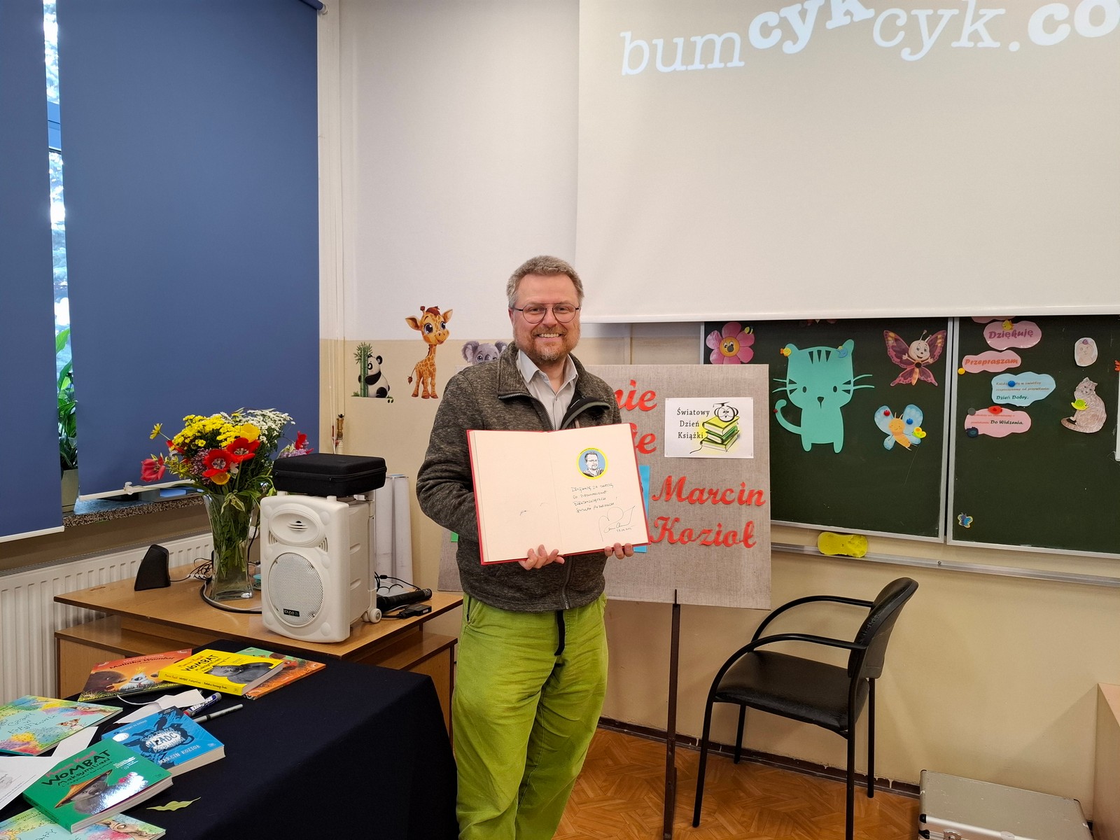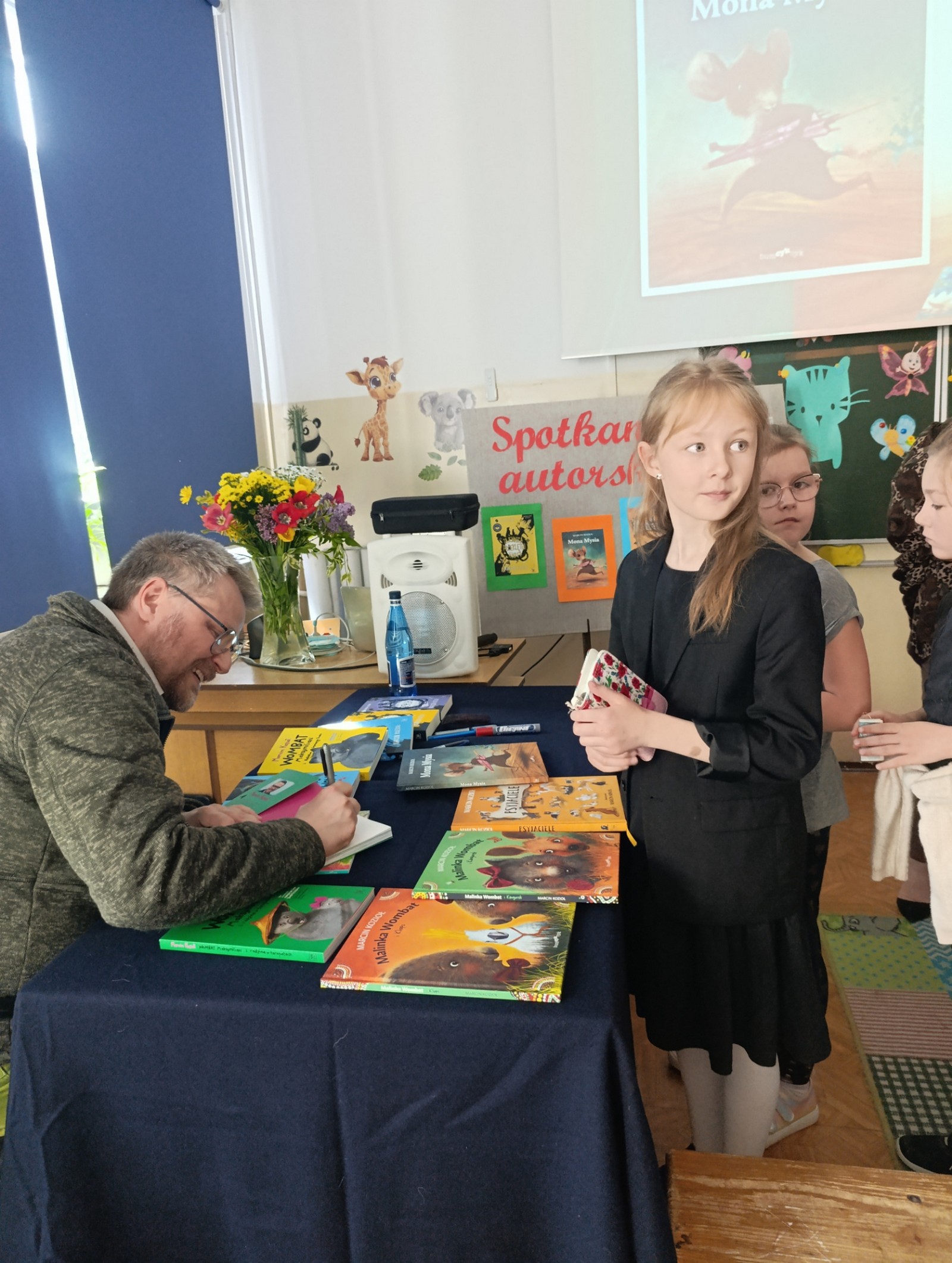 29.04.2025 r. w naszej szkole odbyło spotkanie autorskie z panem Marcinem Koziołem, pisarzem tworzącym dla dzieci i młodzieży, autorem lektury szkolnej (dla klas 4-6) „Skrzynia Władcy Piorunów" i jej dwóch kontynuacji: „Tajemnica przeklętej harfy" („Złota Dwudziestka" książek dwudziestolecia kampanii „Cała Polska czyta dzieciom") oraz „Gwiazda Blachonosego". Zapalony podróżnik, przez wiele lat dyrektor mediów elektronicznych National Geographic Polska. Zwiedził ponad sześćdziesiąt krajów. Książkowym odbiciem pasji podróżniczej jest nagradzana seria o Wombacie Maksymilianie (Nagroda Magellana dla najlepszej książka podróżniczej dla dzieci roku). W 2022 roku ukazała się książka „Psyjaciele", której bohaterami są psy... Chopina, Sienkiewicza, Żeromskiego i innych. Książkę zilustrował Marcin Minor. Miłość do koni znalazła odzwierciedlenie w utworze „Czary w Kopytkowie" (jej współautorką jest Katarzyna Dowbor). W 2024 ukazała się książka przygodowa o sztuce „Mona Mysia" z wyjątkowymi ilustracjami Moniki Urbaniak. To ta ostatnia pozycja książkowa stała się inspiracją do spotkania autora książek z uczniami klas I – III. Natomiast uczniowie klas IV – VIII uczestniczyli w zajęciach: ,,Spotkanie z lekturą ,,Skrzynia Władcy Piorunów, Nikola Tesla i elektryzująca nauka".